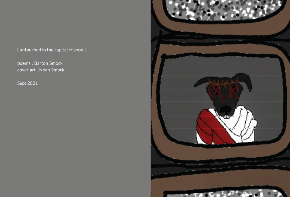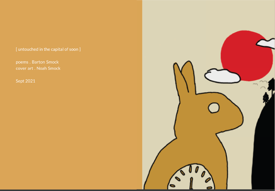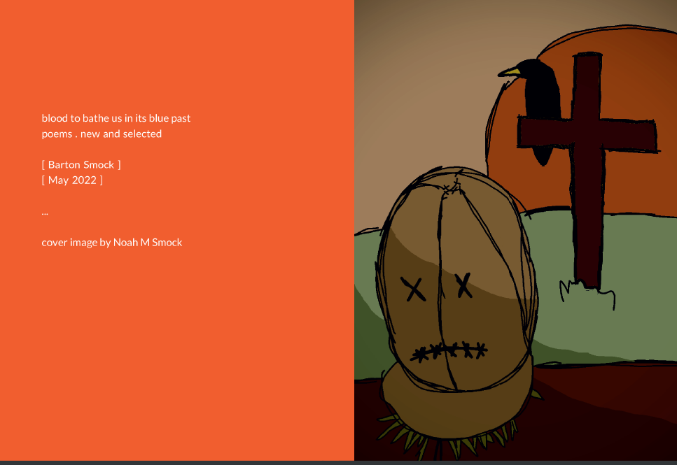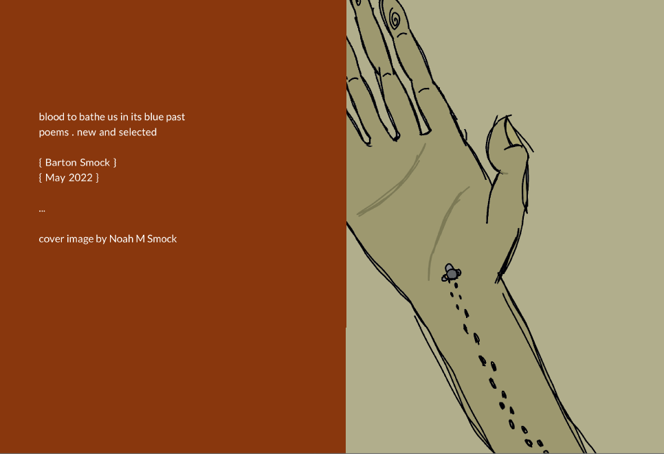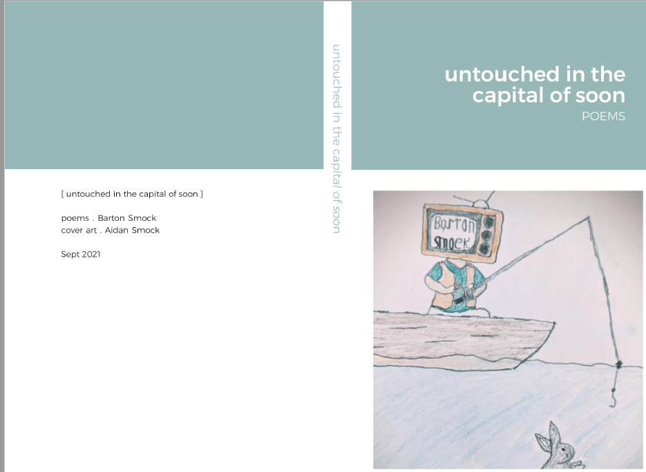 This is just to say that my sons are not AI and did the covers of my two most recent poetry collections. Collections are pay what you want. untouched in the capital of soon, 187 pages poems, Sept 2021 can be purchased via paypal (bartsmock@gmail.com) or Venmo: @Barton-Smock-2 or CashApp: $BartonSmock blood to bathe us in its blue past, 217 pages poems new and selected, May 2022 can be purchased via paypal (bartsmock@gmail.com) or Venmo: @Barton-Smock-2 or CashApp: $BartonSmock