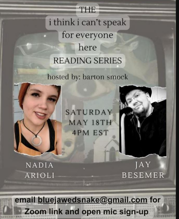 The first of two events this weekend for the 'I think I can't speak for everyone here' reading series. You can email bluejawedsnake@gmail.com for the zoom link and to sign-up for the open mic