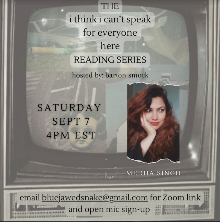 Please join us on Saturday 9/7 at 4pm EST for the 12th installment of the I Think I Can't Speak For Everyone Here reading series. Featured reader will be Medha Singh.