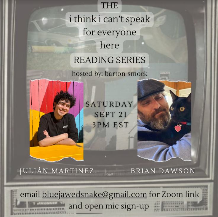 Please join us for the 15th installment of the 'I Think I Can't Speak For Everyone Here' reading series, on Saturday 9/21, at 3pm EST, with featured readers Brian Dawson and Julián Martinez. Email bluejawedsnake@gmail.com for the Zoom link info and to sign-up for the open mic.