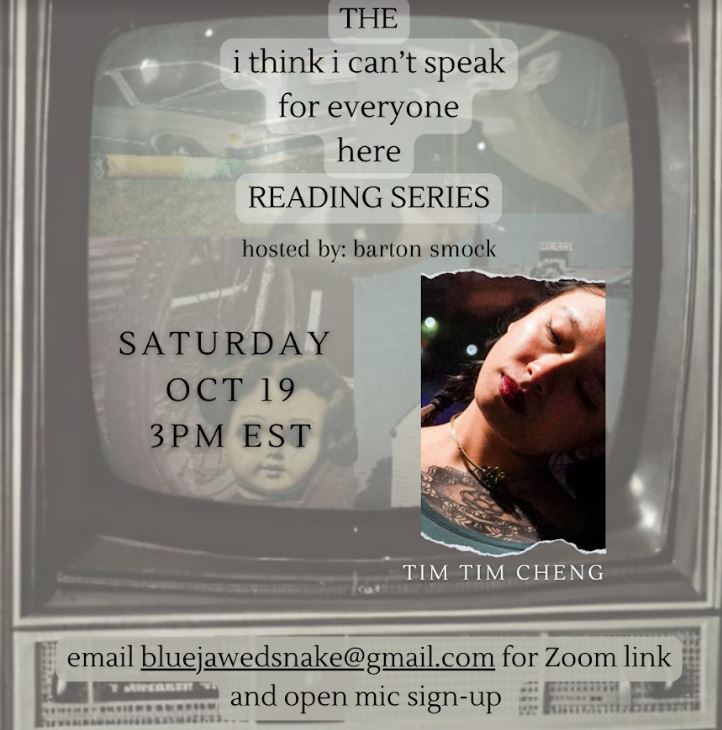 Please join us over Zoom on Saturday, October 19th, at 3pm EST for the next installment of the 'I Think I Can't Speak For Everyone Here' reading series.