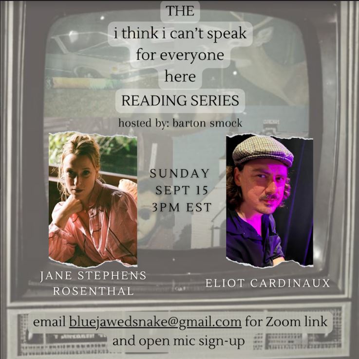 Please join us on Sunday September 15th for the 14th installment of the 'I Think I Can't Speak For Everyone Here' reading series. Featured readers will be Eliot Cardinaux and Jane Stephens Rosenthal.